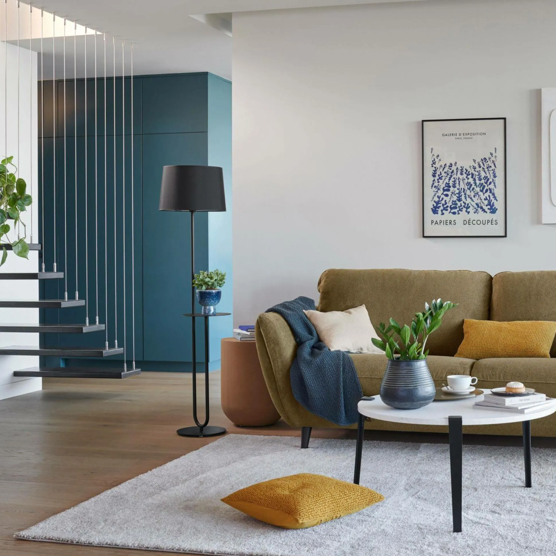 Courbes rondes et harmonieuses pour le lampadaire DUO. Il allie l’utile à la décoration avec sa jolie tablette. Ce lampadaire est coiffé d’un abat-jour en tissu contrecollé noir qui procure un éclairage feutré et subtil pour un ensemble tout en douceur. Ce luminaire meuble de manière originale et pratique un coin salon, un espace de réception ou un hall d’accueil.