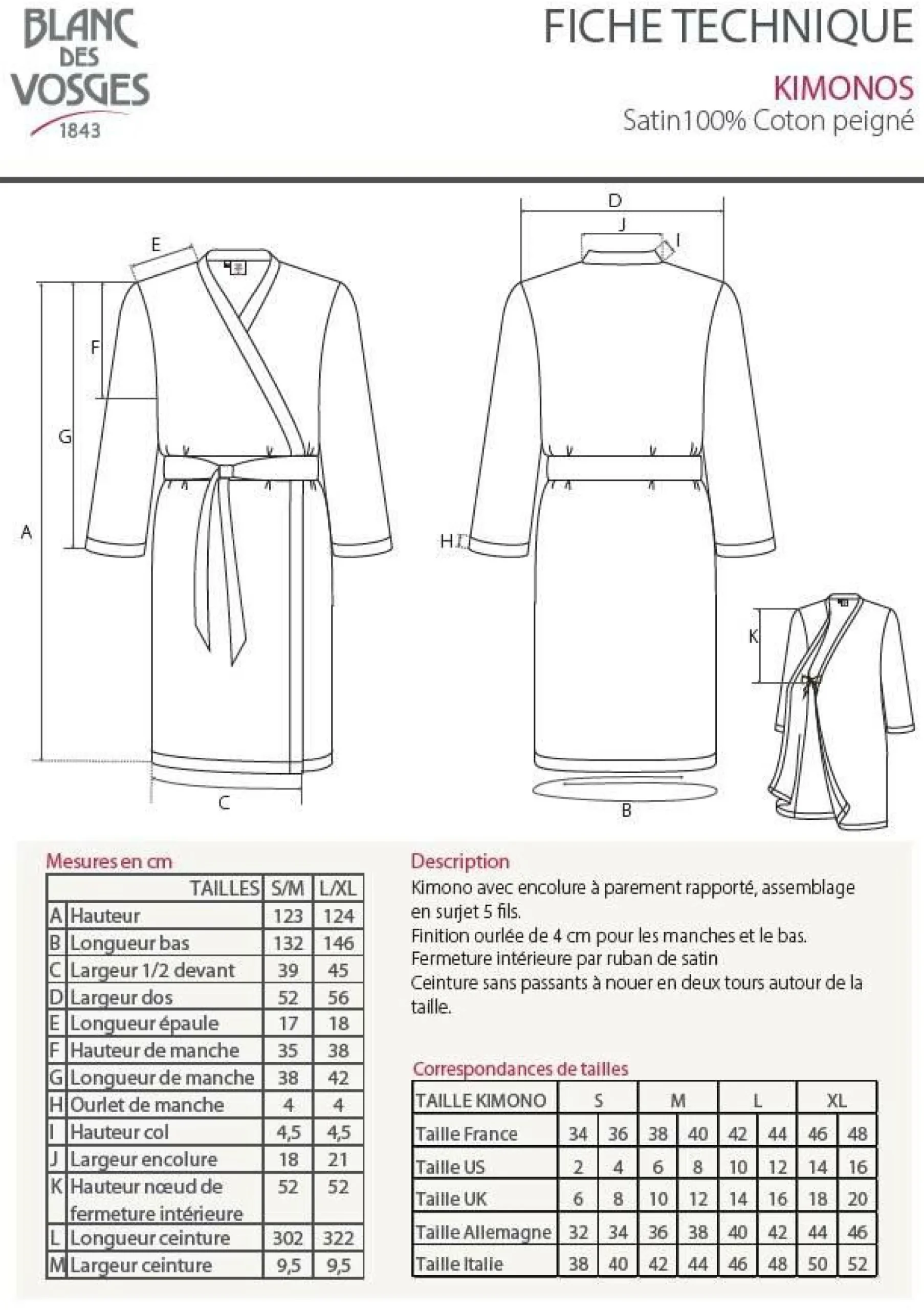 Il comporte une large ceinture à nouer et les manches sont évasées. Il est disponible en plusieurs tailles, du S au XL.
