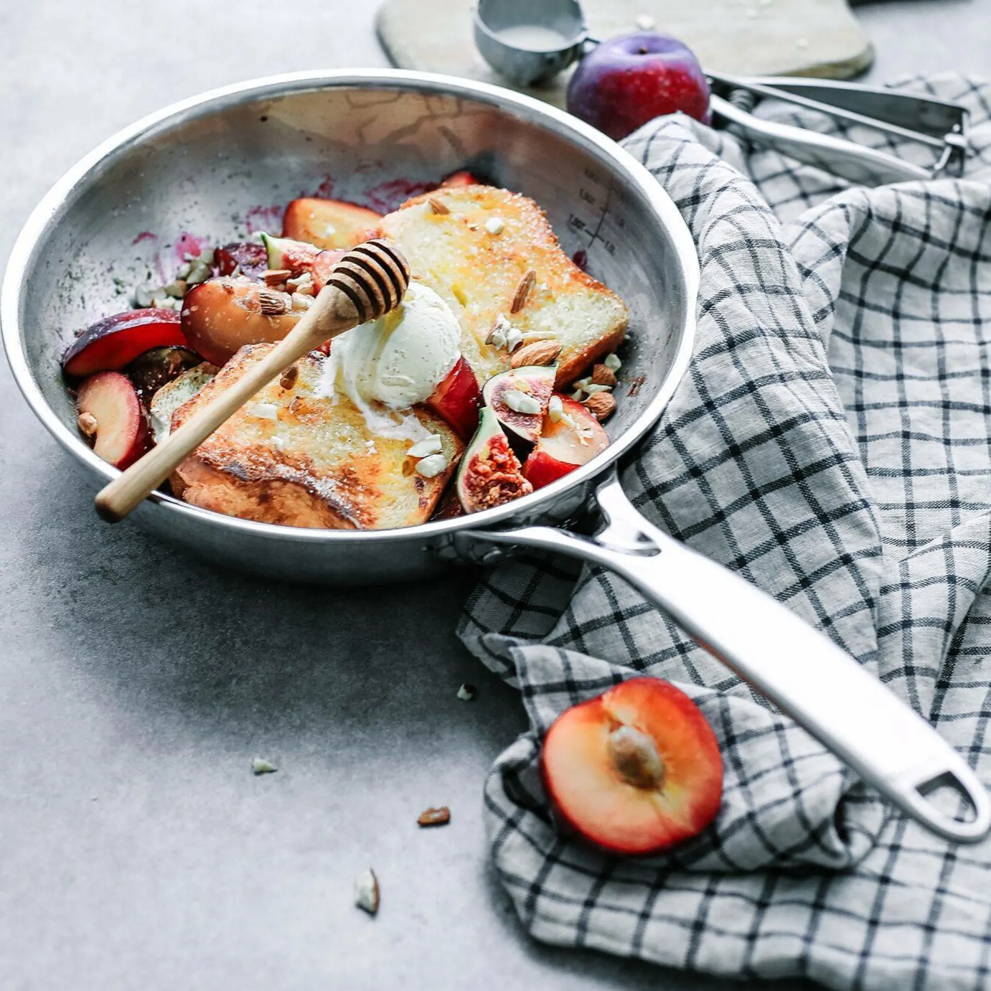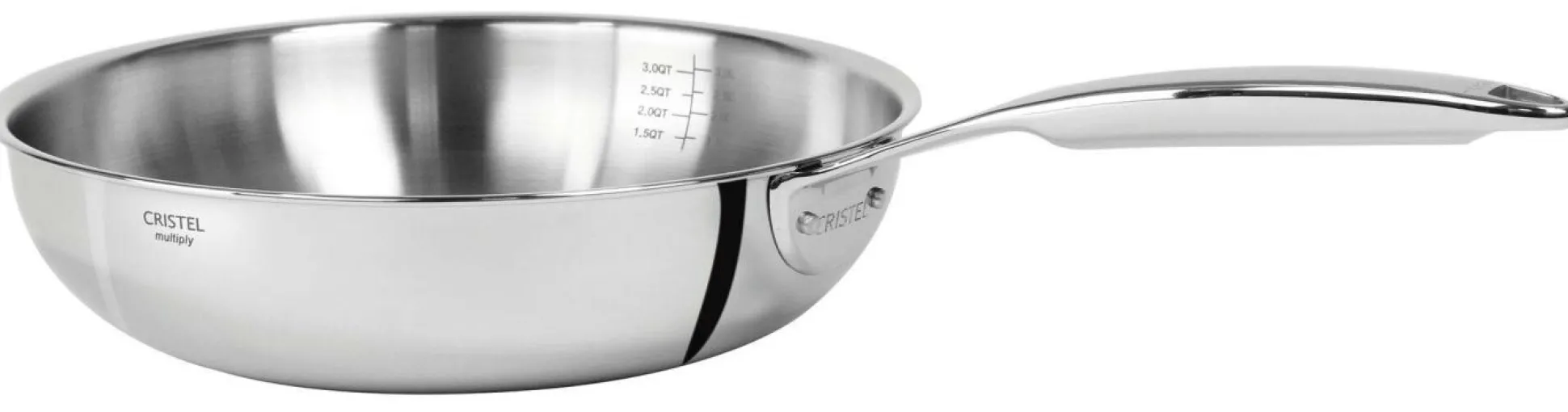 Poêle sautoir inox 5-ply collection Castel’Pro, finition brillant miroir avec fond thermodiffuseur 5 couches, poignée fixe en fonte d’inox. Graduations intérieures.