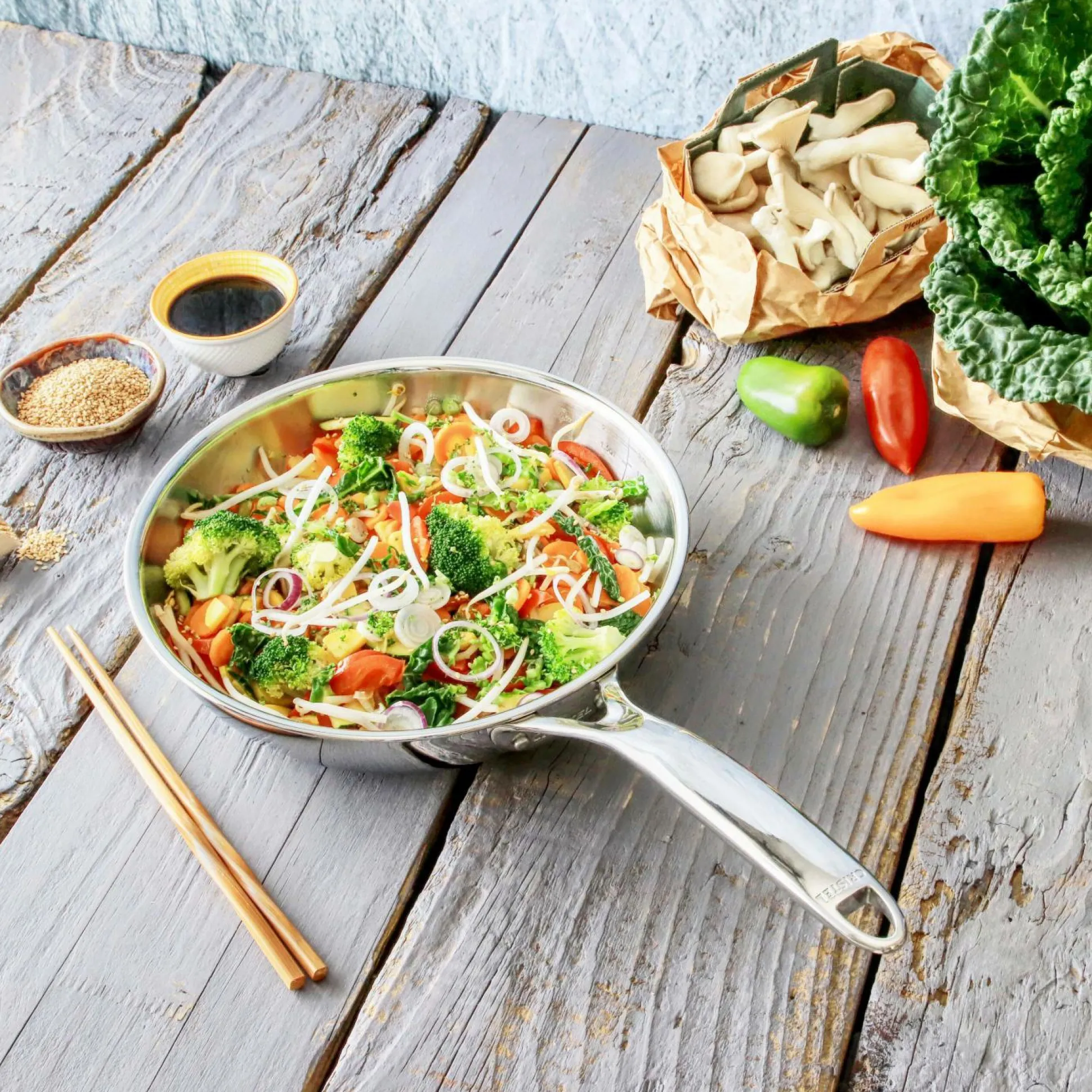 La forme unique tout en rondeur du corps de l’ustensile est idéale pour mélanger, faire sauter et cuire.