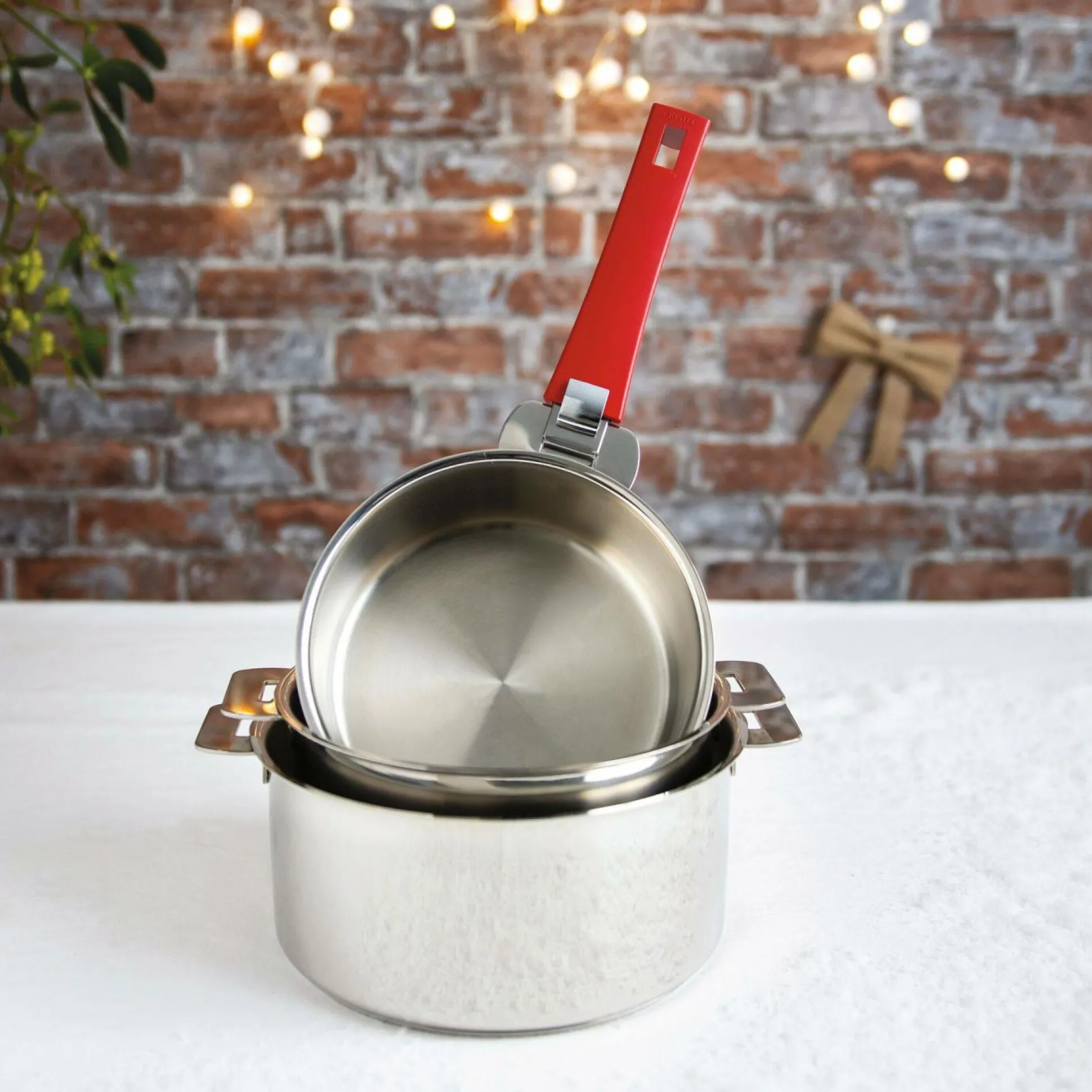Lot de 3 casseroles CRISTEL Mutine poignée amovible avec fond thermo-diffuseur permet de laisser mijoter, sans attacher. Le concept amovible de Cristel est unique, la poignée se fixe et s’enlève avec facilité et sécurité. Les casseroles s’emboîtent totalement et ne prennent pas de place, ni dans les placards, ni dans le lave-vaisselle, ni sur la table de cuisson.