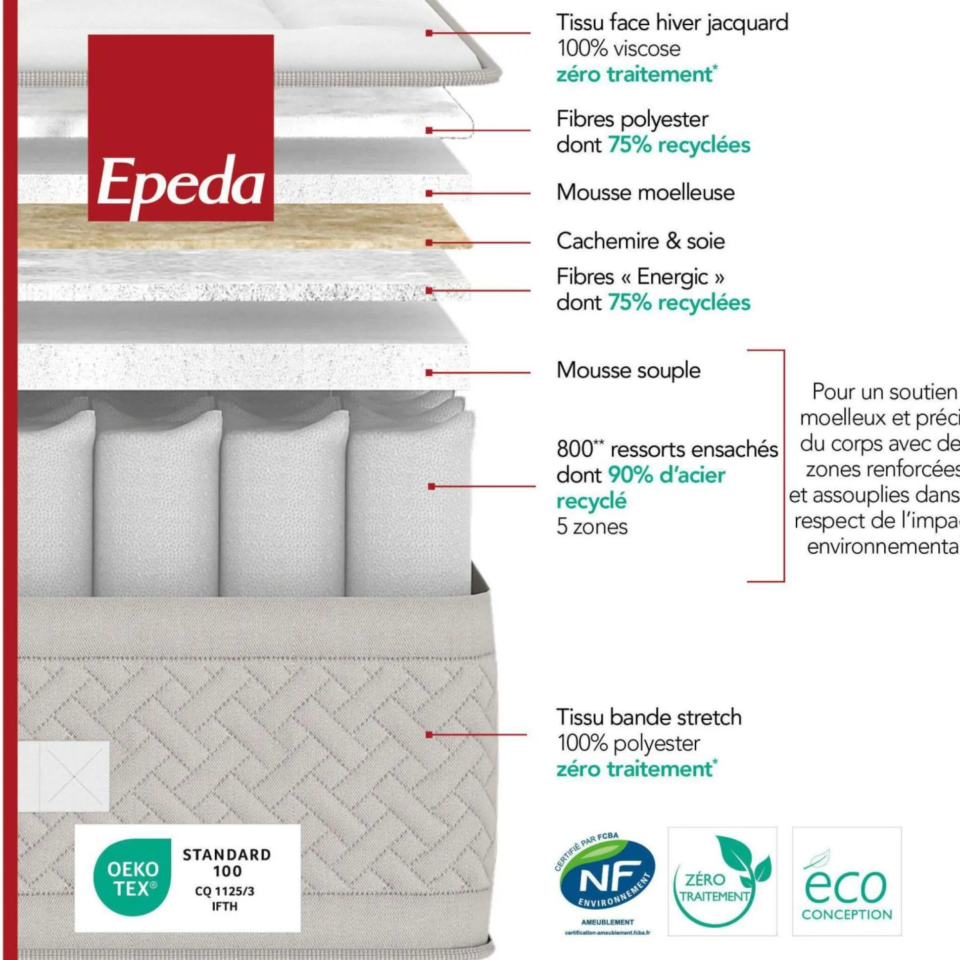 Embellissez votre chambre et vos nuits avec le matelas Le Majestueux EPEDA, profitez de son âme en ressorts ensachés et ses garnissages nobles en soie, cachemire et fibres recyclées. Il vous offre un accueil très enveloppant pour des nuits douces. Ce produit ne contient aucune substances actives.