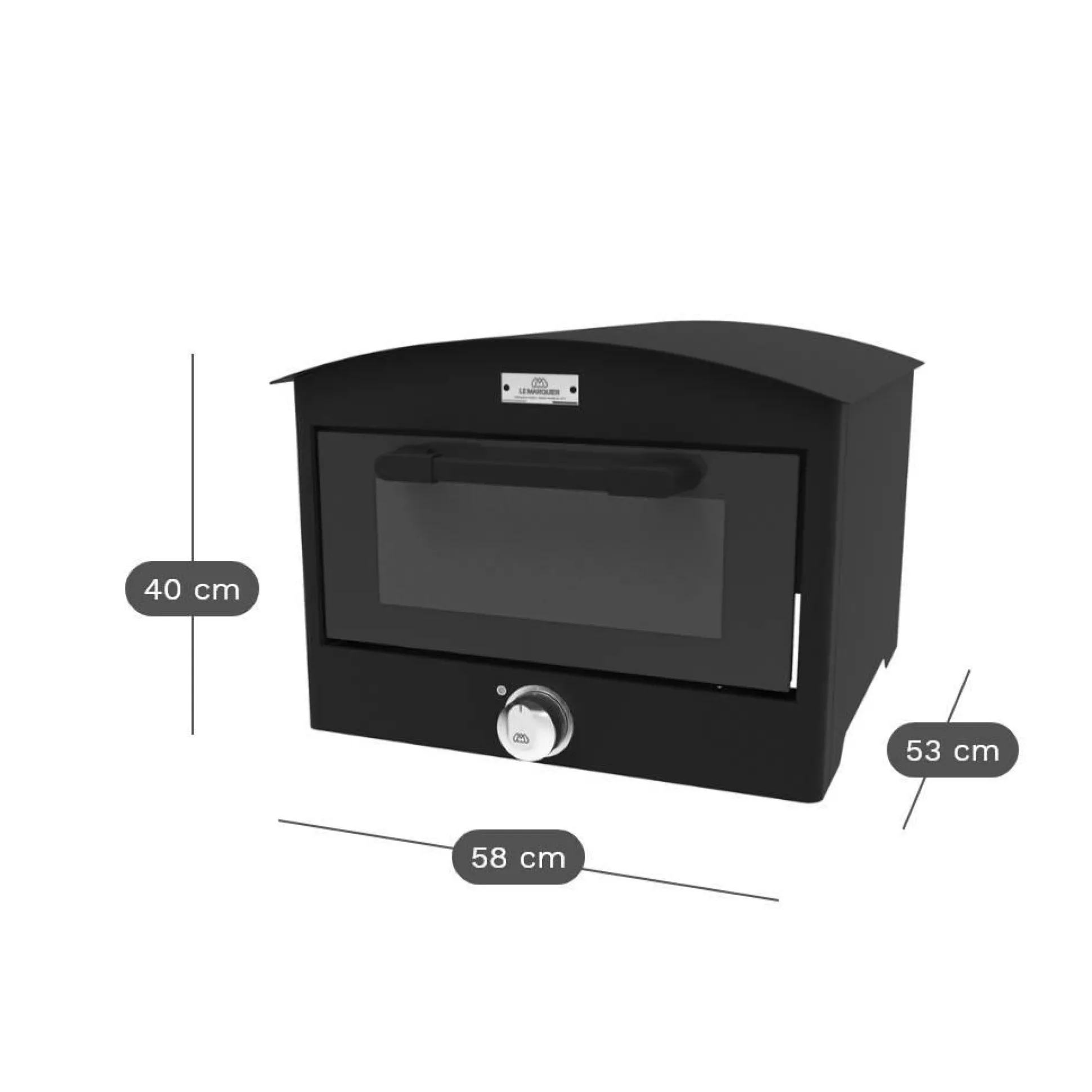 La praticité est au rendez-vous avec la porte vitrée et l’éclairage intérieur, facilitant la surveillance de la cuisson. Deux résistances (supérieure et inférieure) avec thermostat permettent un contrôle précis de la température. Le bouton de commande, accompagné d’un témoin lumineux de mise en chauffe, simplifie son utilisation. Le châssis et le toit en acier peinture époxy, au coloris noir élégant, ajoutent une touche moderne à cet équipement indispensable. Profitez de chaque instant convivial avec ce four à pizza, le compagnon idéal pour des moments de partage gourmands en famille ou entre amis.