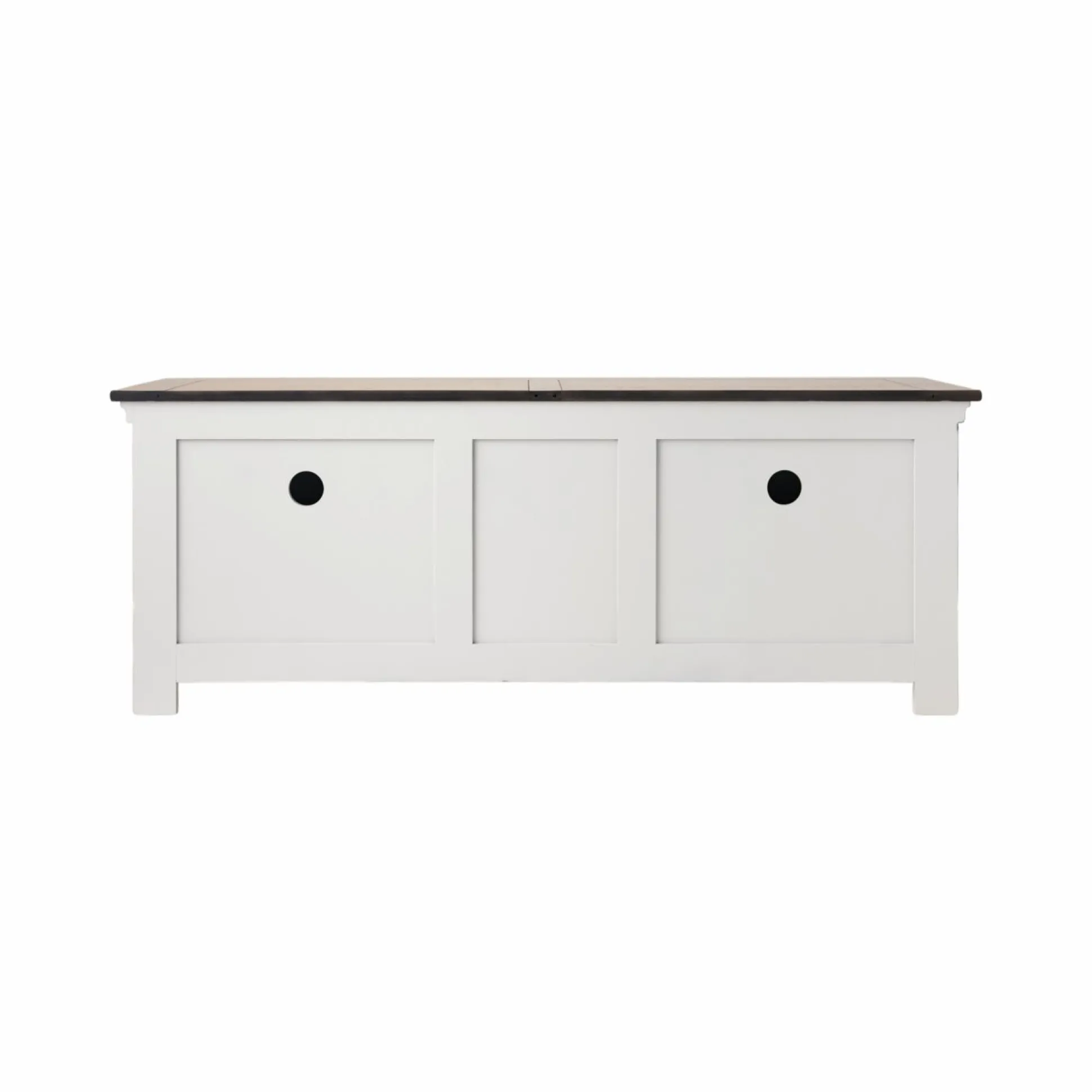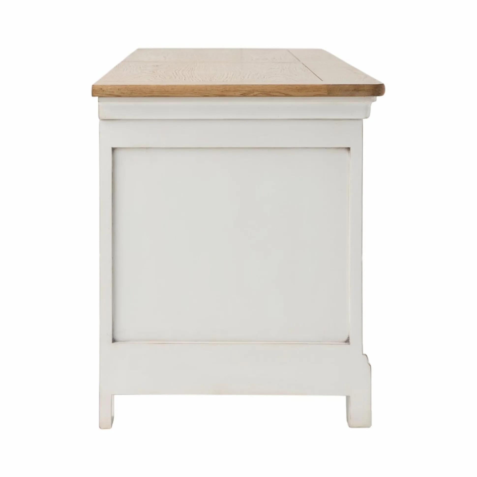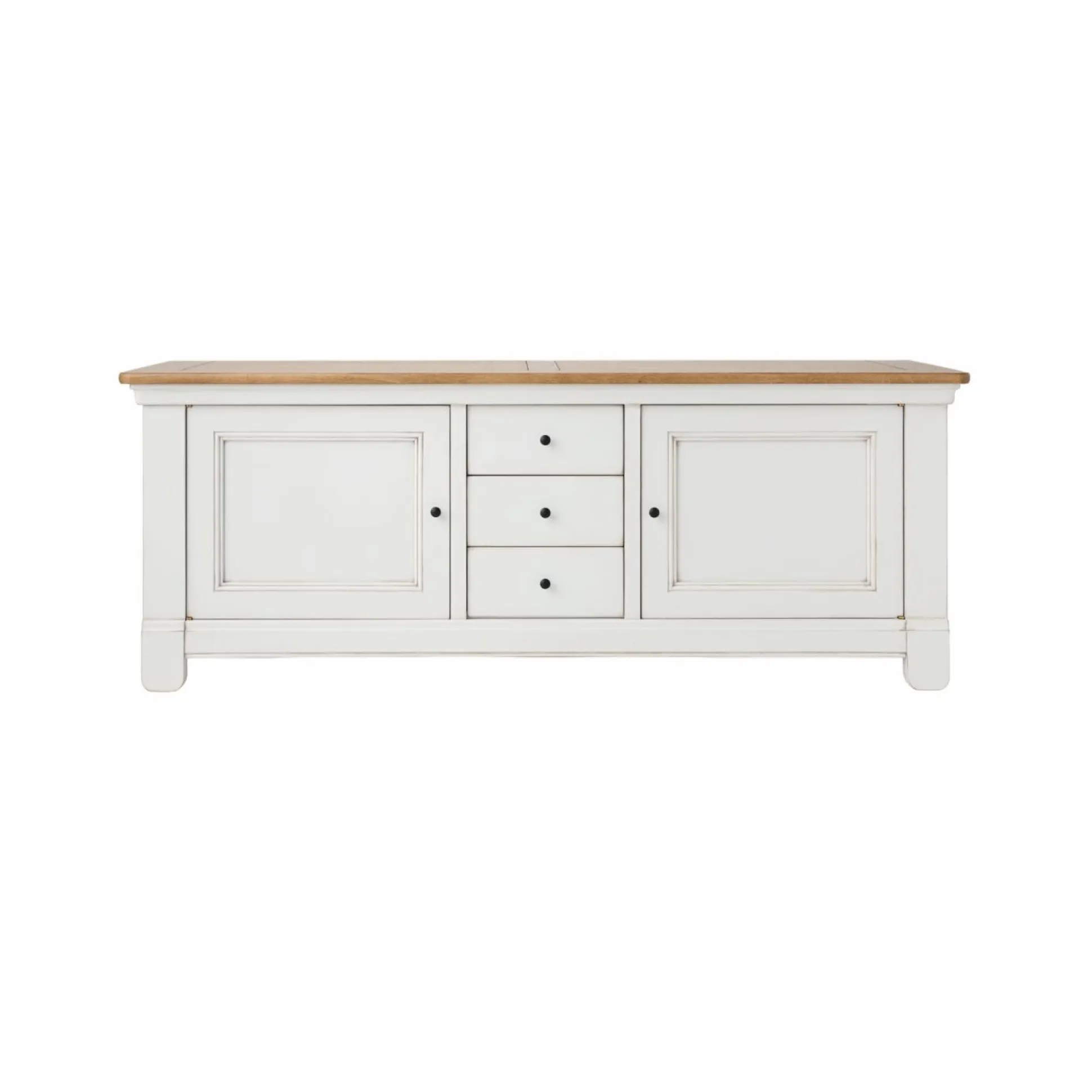 Ses lignes sobres sont mises en valeur par des moulures et un plateau en placage chêne qui réchauffe l’ensemble. Sa finition antiquaire, appliquée à la main, révèle des marques d’usure volontairement visibles, donnant à chaque pièce un caractère unique, comme patiné par le temps.