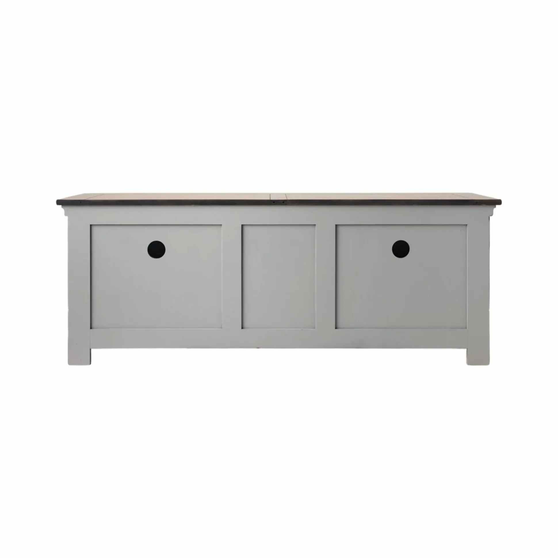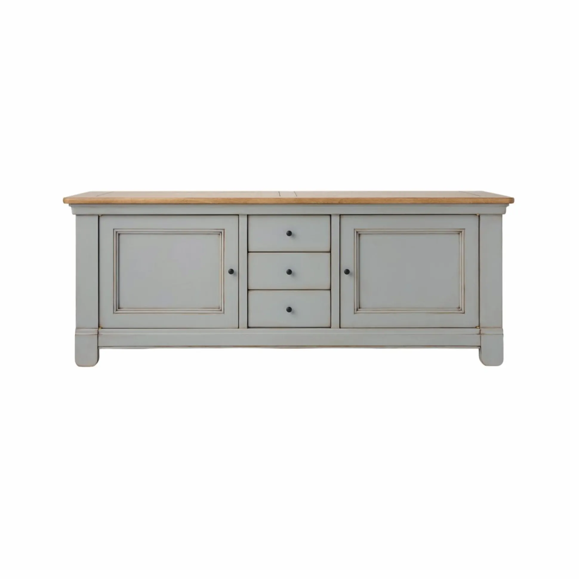 Ses lignes sobres sont mises en valeur par des moulures et un plateau en placage chêne qui réchauffe l’ensemble. Sa finition antiquaire, appliquée à la main, révèle des marques d’usure volontairement visibles, donnant à chaque pièce un caractère unique, comme patiné par le temps.