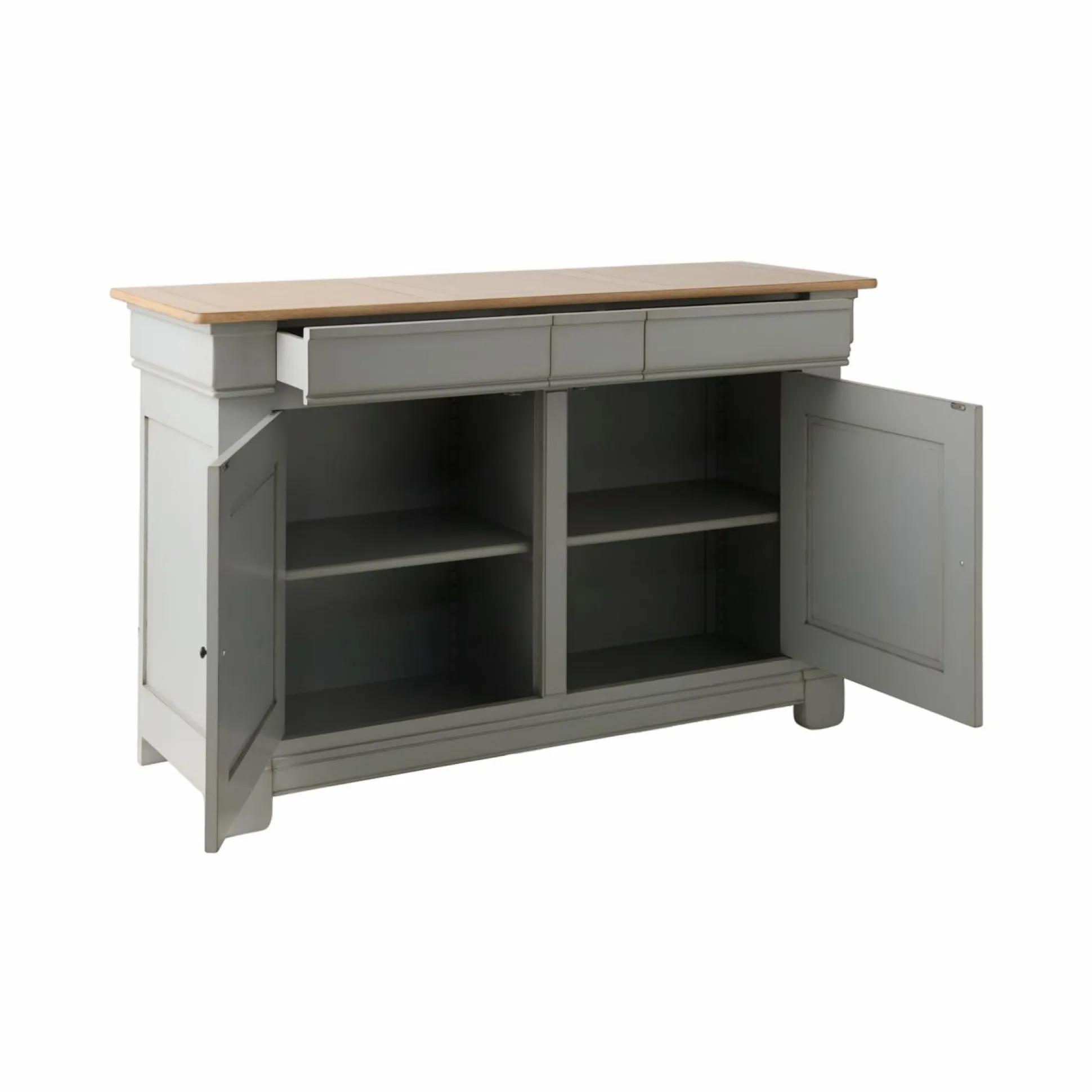 Le plateau en placage chêne réchauffe la pièce et accueille vos objets décoratifs avec raffinement. Fonctionnel, ce buffet offre un espace de rangement grâce à ses deux portes abritant une étagère réglable, idéal pour organiser la vaisselle ou le linge de table. Les trois tiroirs discrets permettent de garder à portée de main tout ce que l’on préfère ranger à l’abri des regards.