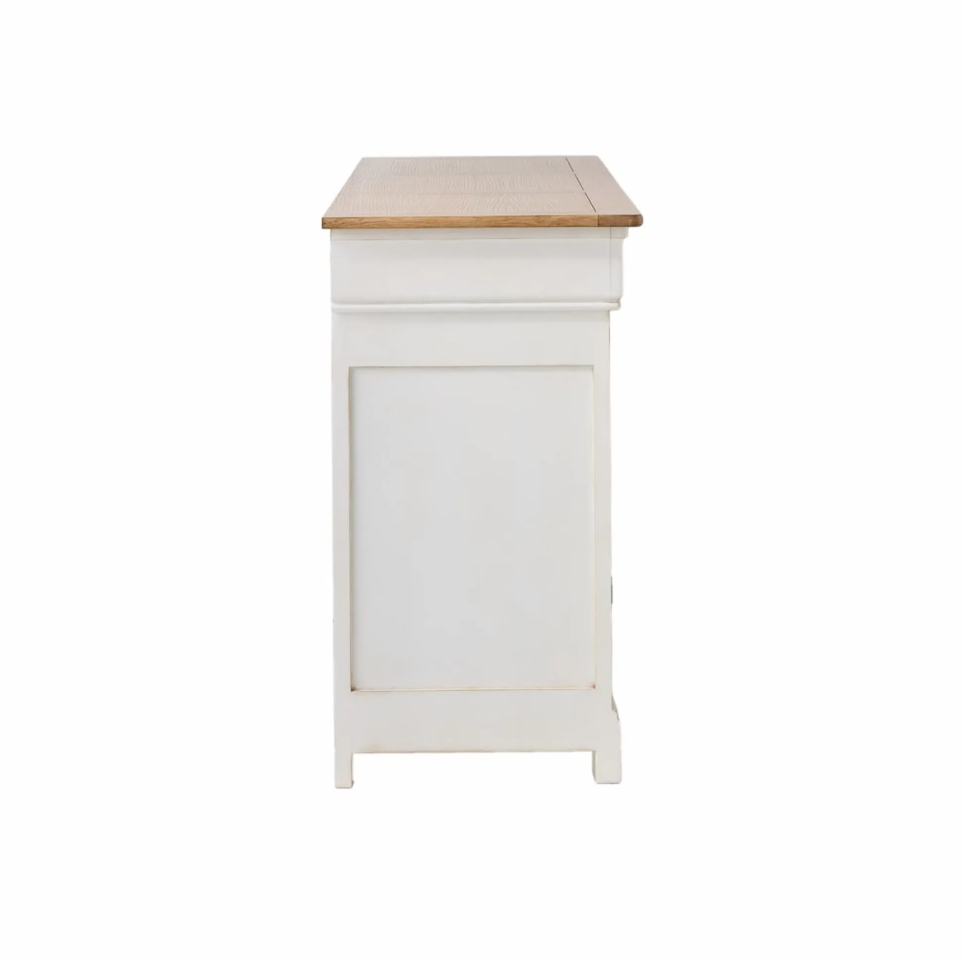 Le plateau en placage chêne apporte une note chaleureuse. À l’intérieur, une étagère réglable permet d’adapter l’espace de rangement selon vos besoins, tandis que trois portes et trois tiroirs accueillent vaisselle ou linge de maison en toute discrétion.