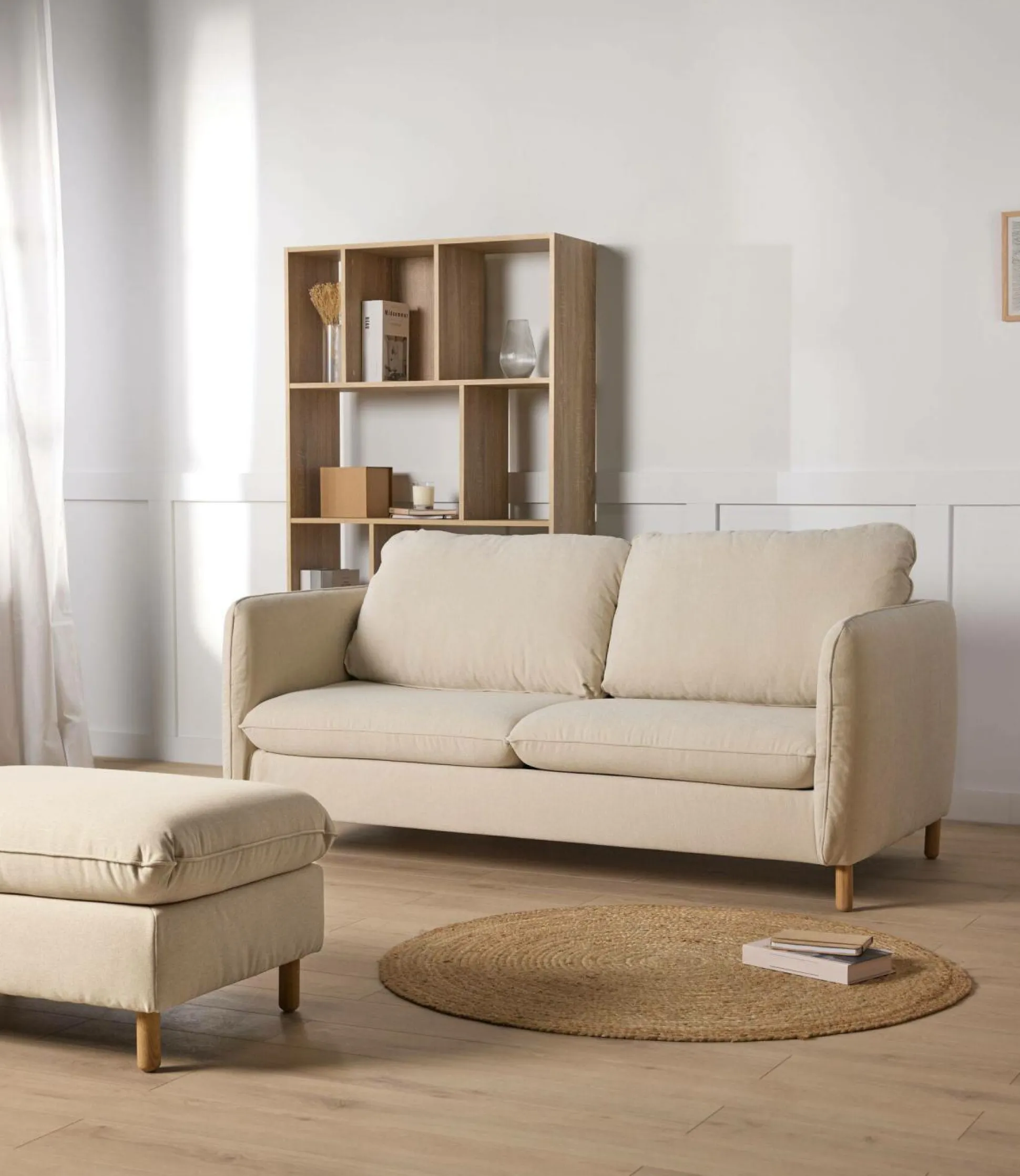 Les pieds en chêne et sa finition passepoil élégante ajoutent une note de raffinement, tandis que son tissu doux est idéal pour un usage quotidien.