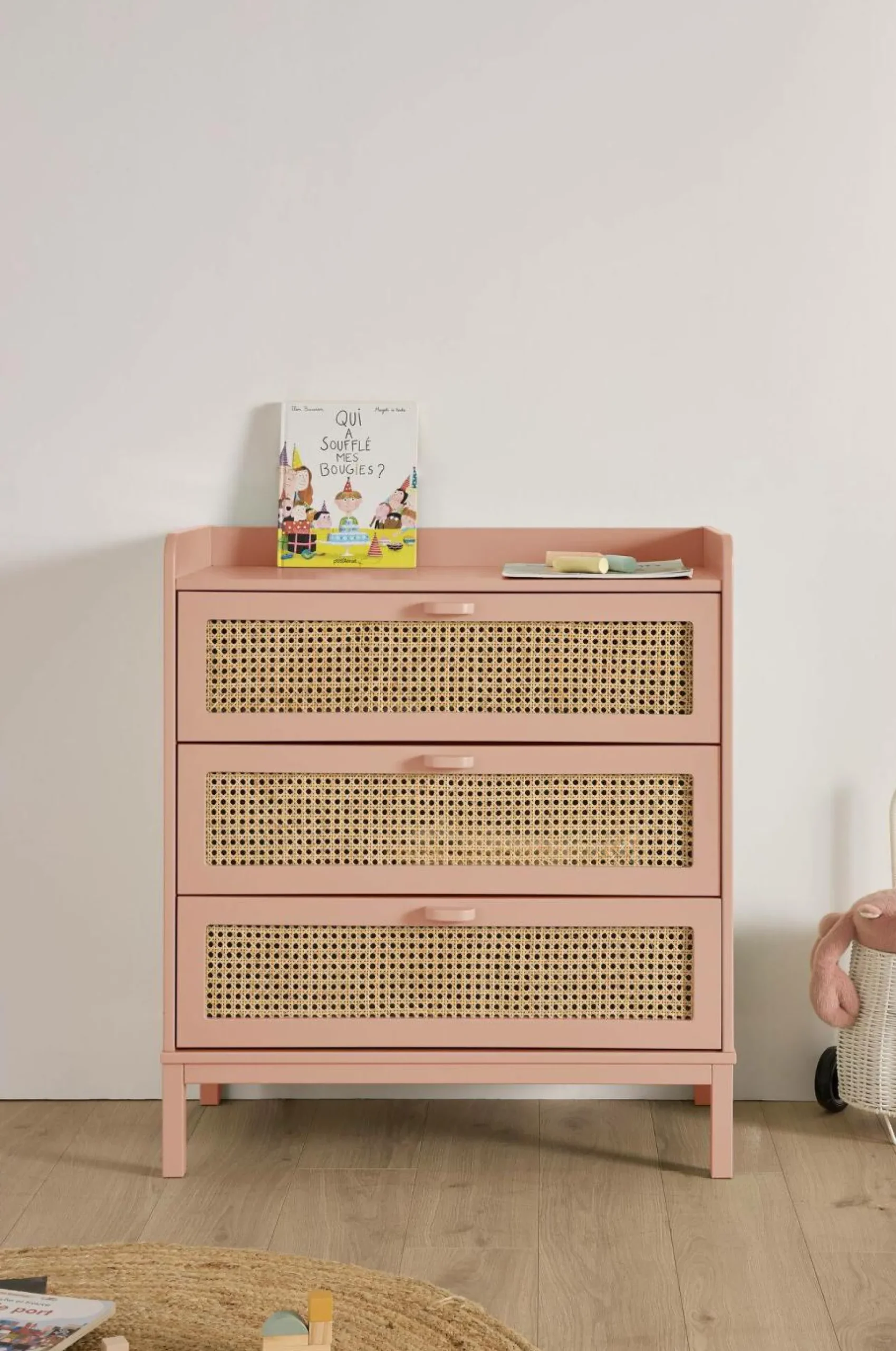 Ses trois tiroirs spacieux offrent un rangement généreux tout en conservant une esthétique soignée. Les façades en cannage, finement travaillées, apportent une touche artisanale et chaleureuse, faisant de cette commode un élément aussi pratique que décoratif.