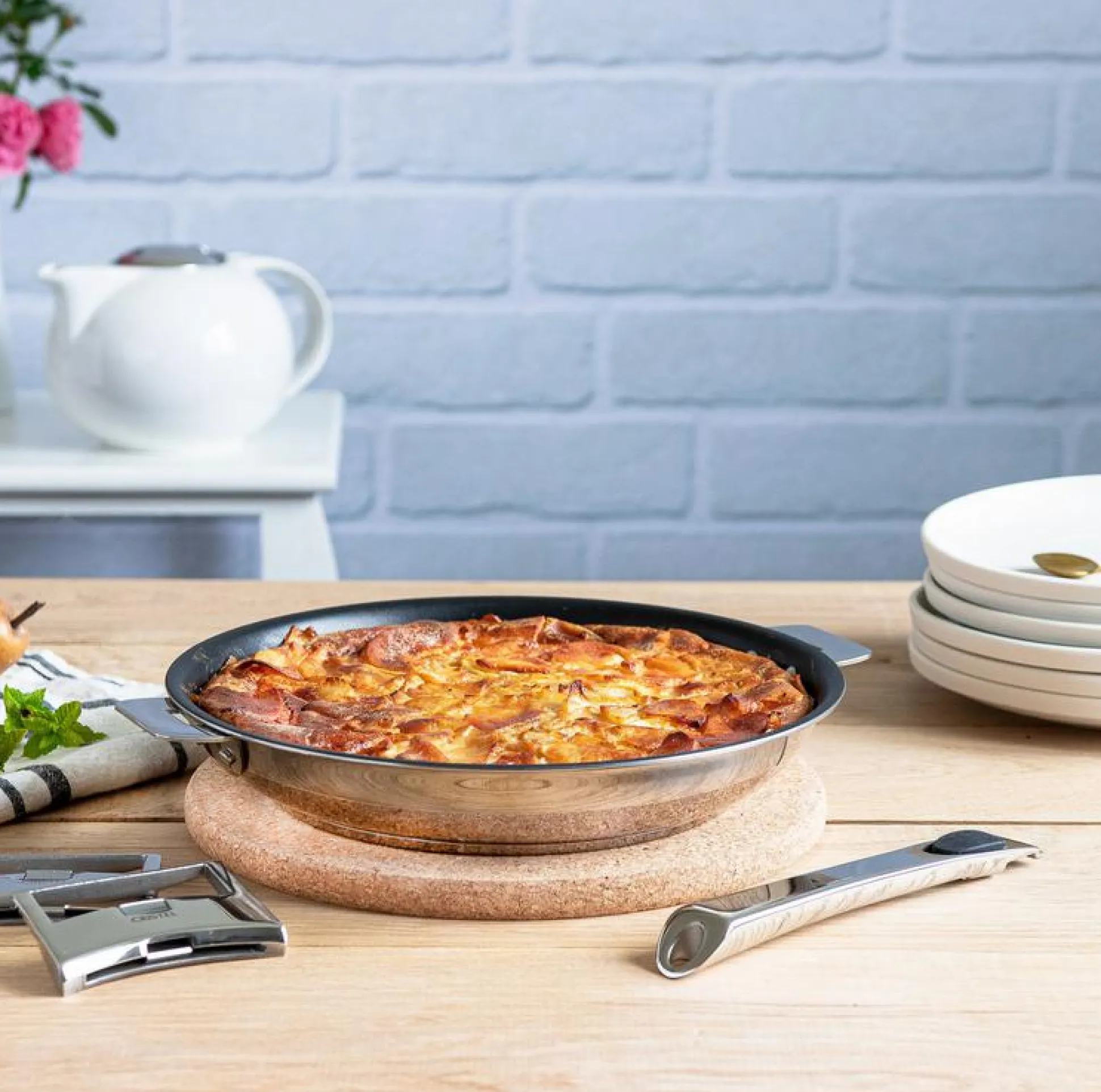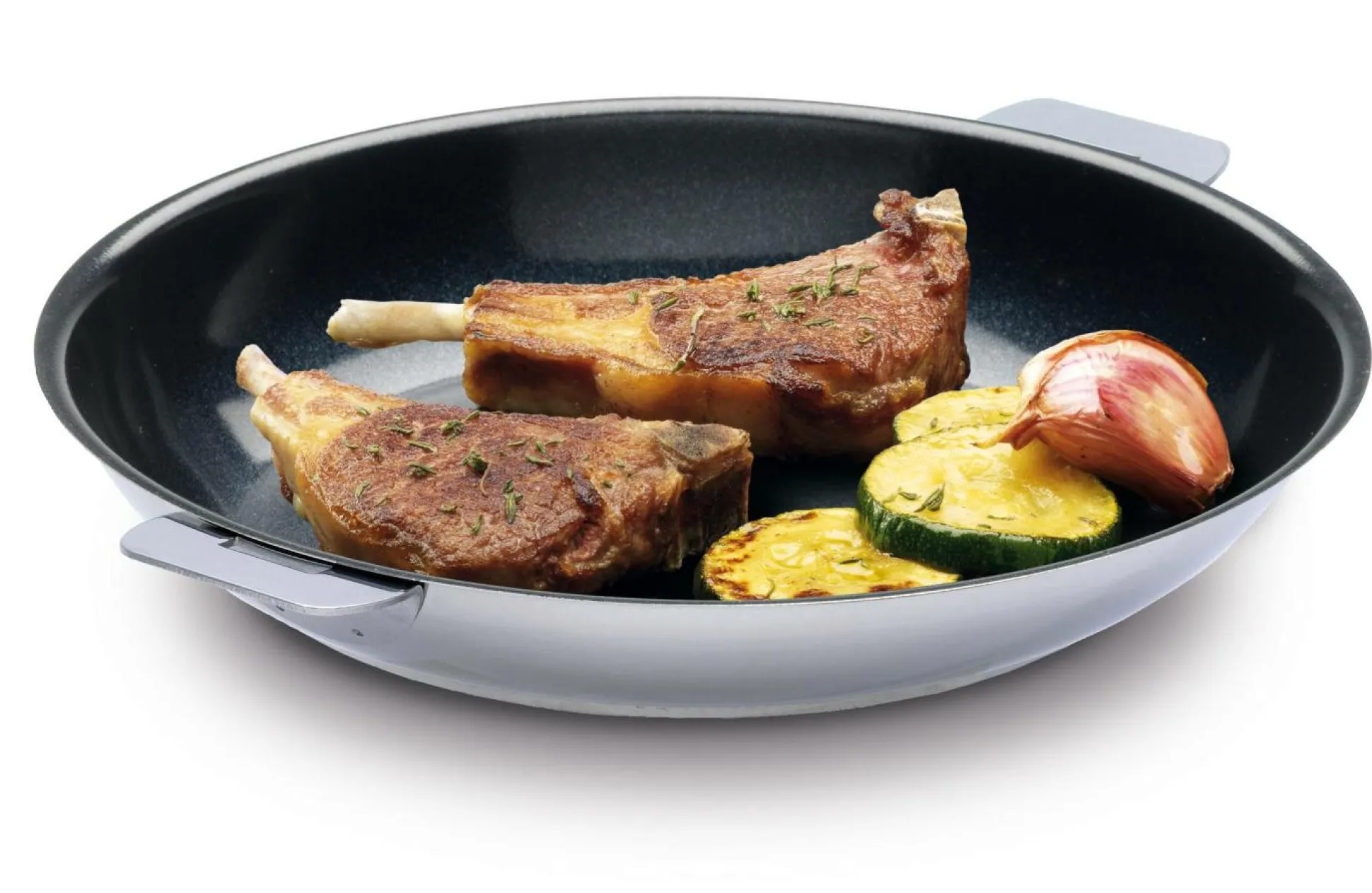 Grâce à sa finition effet miroir, la poêle Casteline passe du feu à la table avec élégance. Son fond thermodiffuseur permet également de conserver la température de votre préparation lors du service.