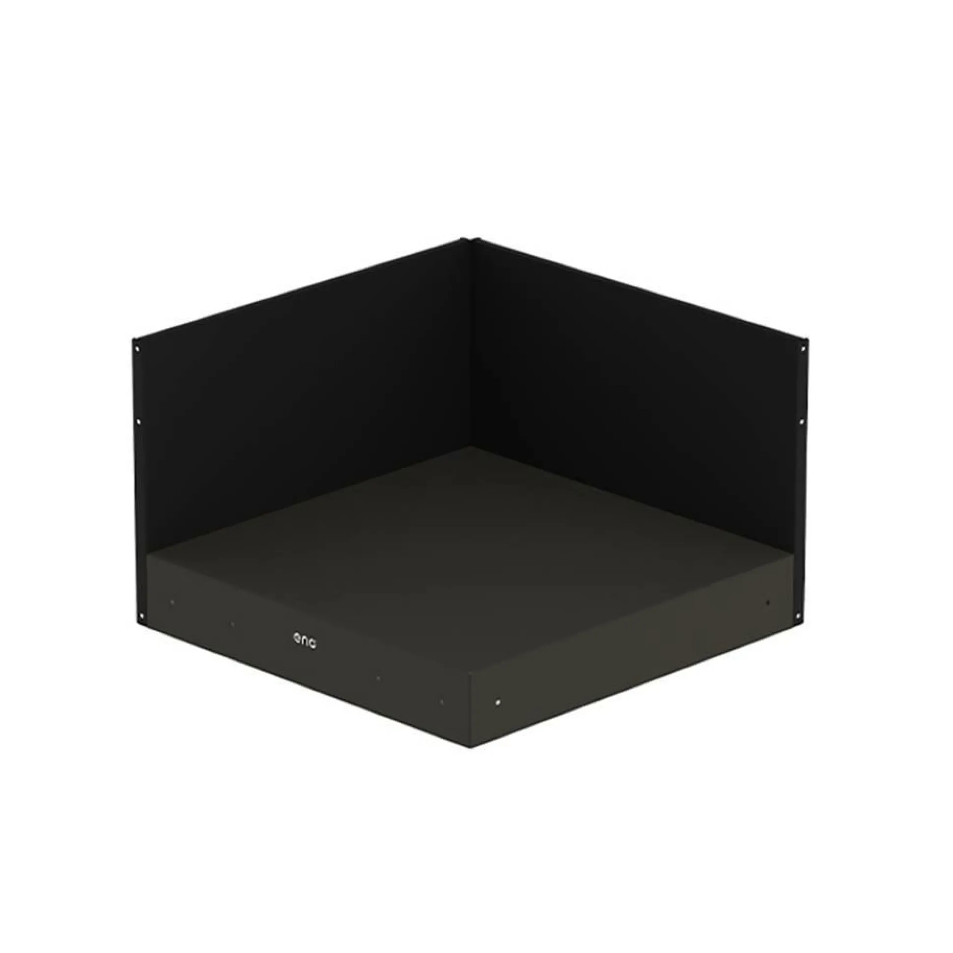 Ce module angle pour cuisine d’extérieur ENO comporte un cadre et un plateau en acier galvanisé gris et deux crédences en acier galvanisé noir.