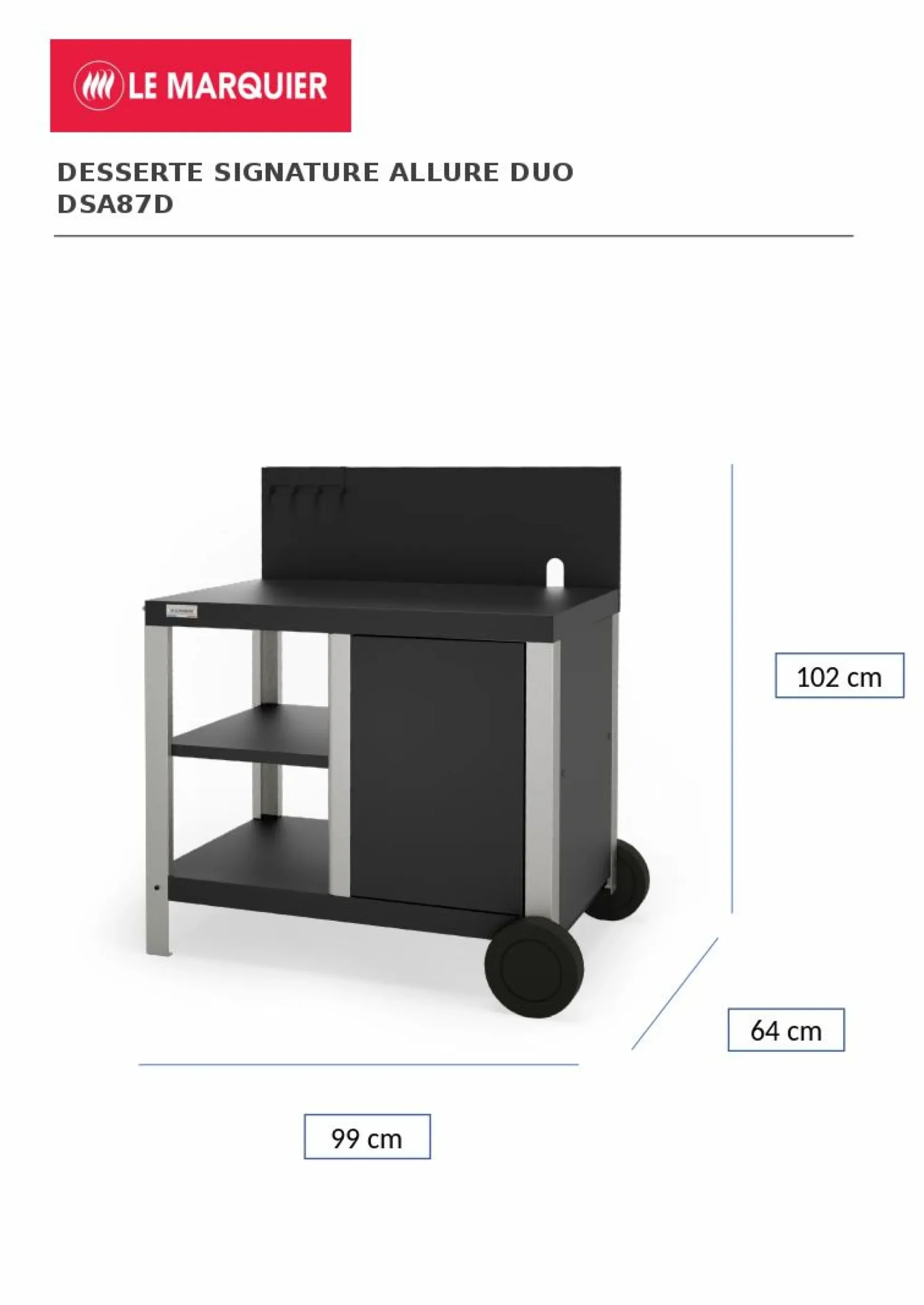 La Desserte Signature Allure Duo Inox et Acier Noir Pour Plancha 260 offre un mobilier extérieur pour plancha design et fonctionnel. Conçue pour durer dans le temps, cette desserte bi-matière est faite en acier électrozingué peinture époxy noir et en inox, pour une résistante à la corrosion. En plus d’être le parfait support pour votre plancha, elle est également simple à déplacer grâce à ses deux roues et sa poignée. Elle propose aussi des solutions de rangement grâce à ses étagères et son cache-bouteille. La crédence haute vous permettra ainsi de limiter les projections de cuisson, en particulier dans le cas où vous souhaitez accoler votre meuble et votre plancha à un mur. Cette même crédence est équipée d’un trou pour faire passer les câbles électriques ou gaz de votre plancha.