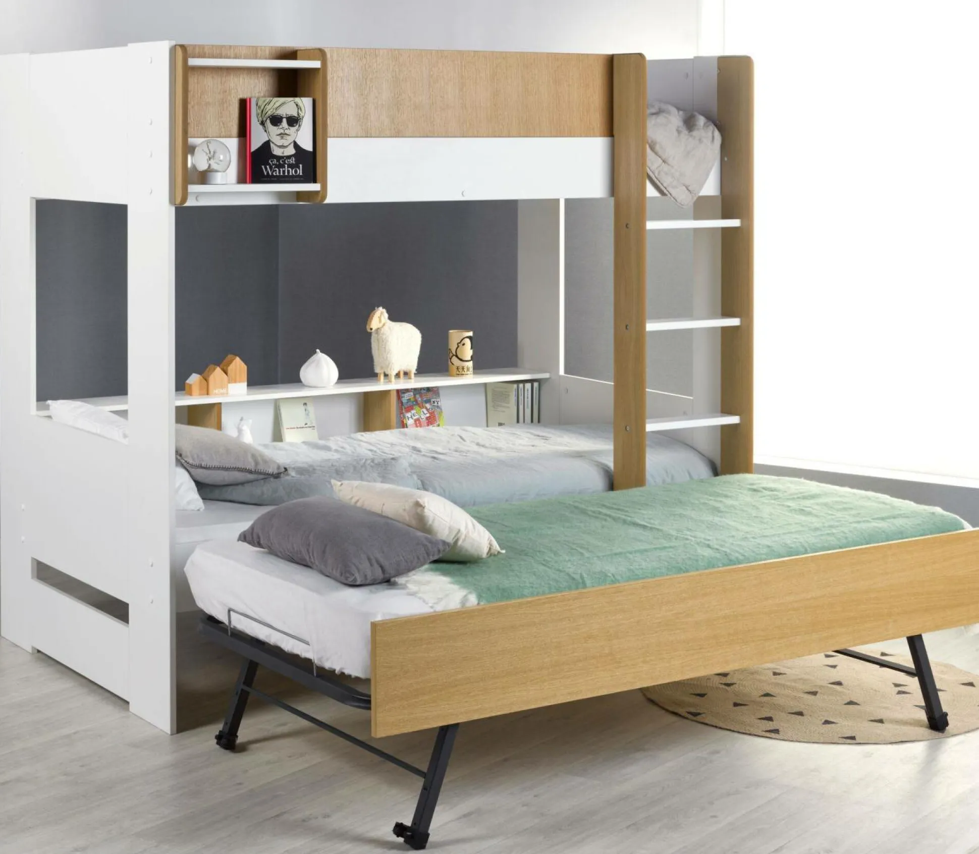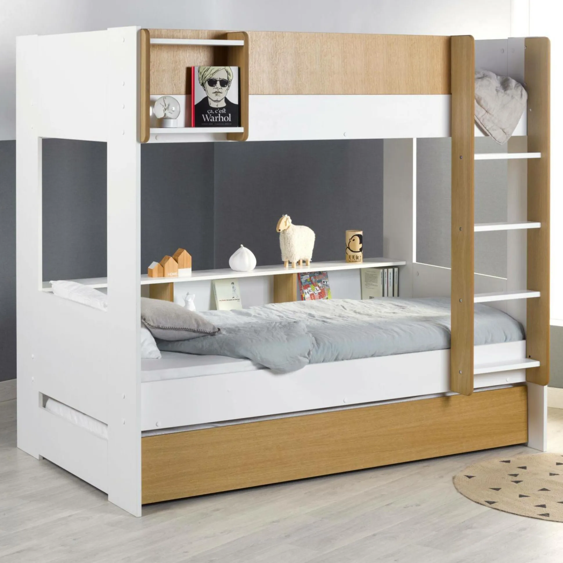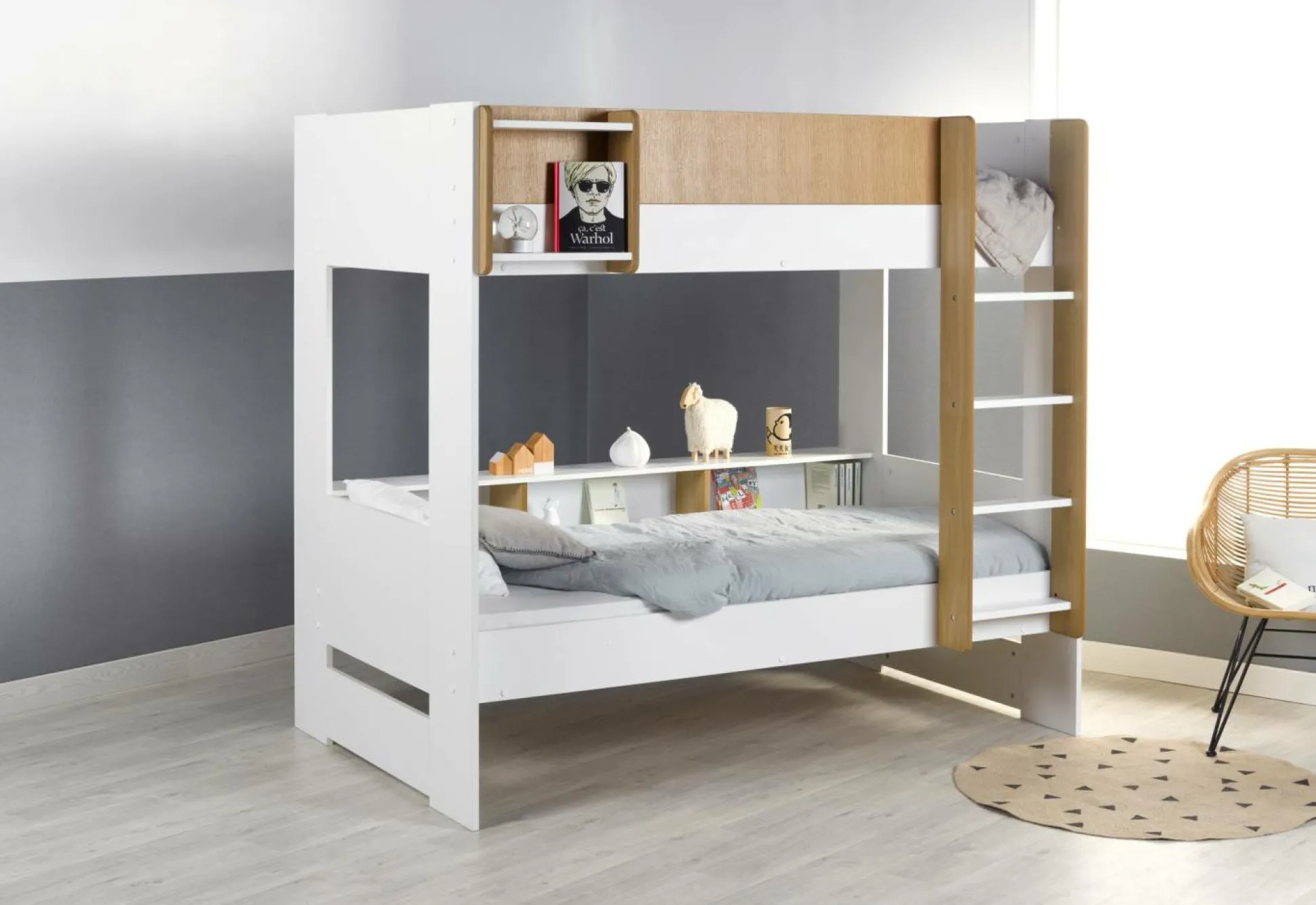 Ce modèle robuste est conçu pour accueillir deux couchages et optimiser l’espace de la chambre tout en accordant à chaque enfant son intimité. Ses contours surélevés et son échelle à marches plates assurent à vos enfants une nuit en toute sécurité.Chaque lit est équipé de 3 rangements et ainsi, chacun pourra créer son univers, son cocon, en y rangeant ses affaires. Petit plus, le lit du haut est équipé d’une étagère supplémentaire. Choisir les lits superposés Séraphin, c’est vous garantir un meuble durable et robuste. La sobriété des couleurs se mariera parfaitement à votre décoration et amènera un côté moderne à votre pièce. Avec les lits superposés Séraphin, optez pour le design sans transiger sur la qualité.