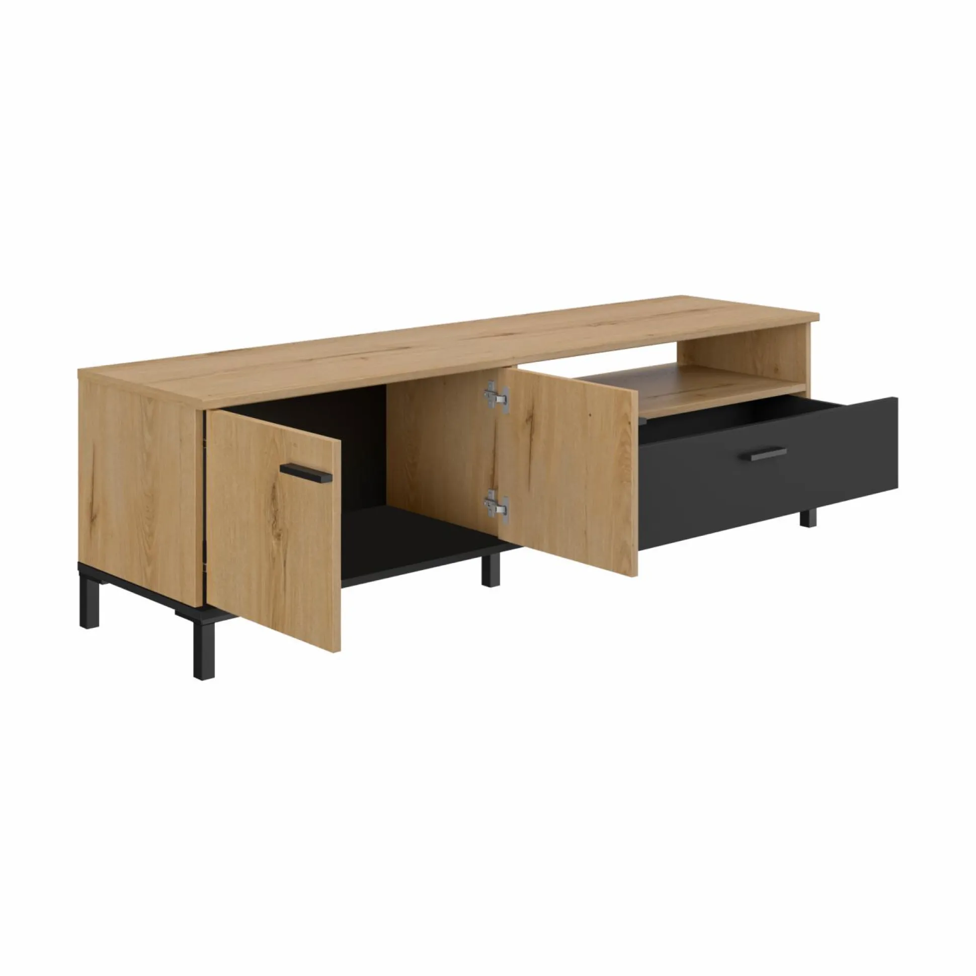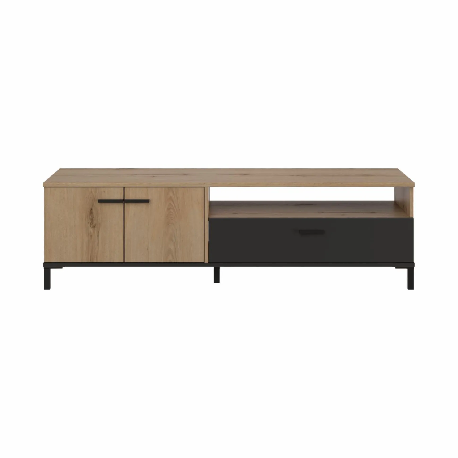 Le contraste entre la finition bois et la face de tiroir noire ajoute une touche contemporaine. Faites de votre coin TV un espace aussi agréable qu’organisé avec ce meuble qui conjugue esthétisme et fonctionnalité.