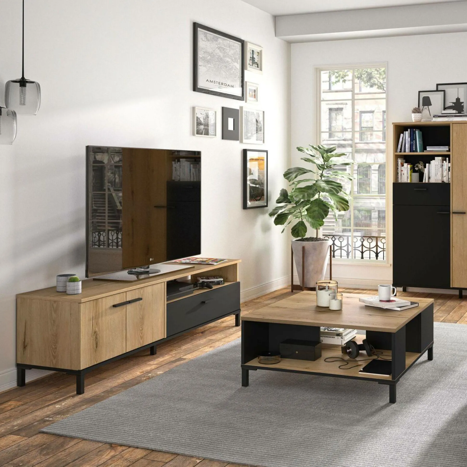 Misez sur un meuble fonctionnel avec un décor bois/noir grâce au meuble TV 2 portes 1 tiroir Germain. Parfait pour les écrans les plus grands grâce à sa longueur généreuse de 160 cm, ce meuble s’impose comme un incontournable dans votre salon.