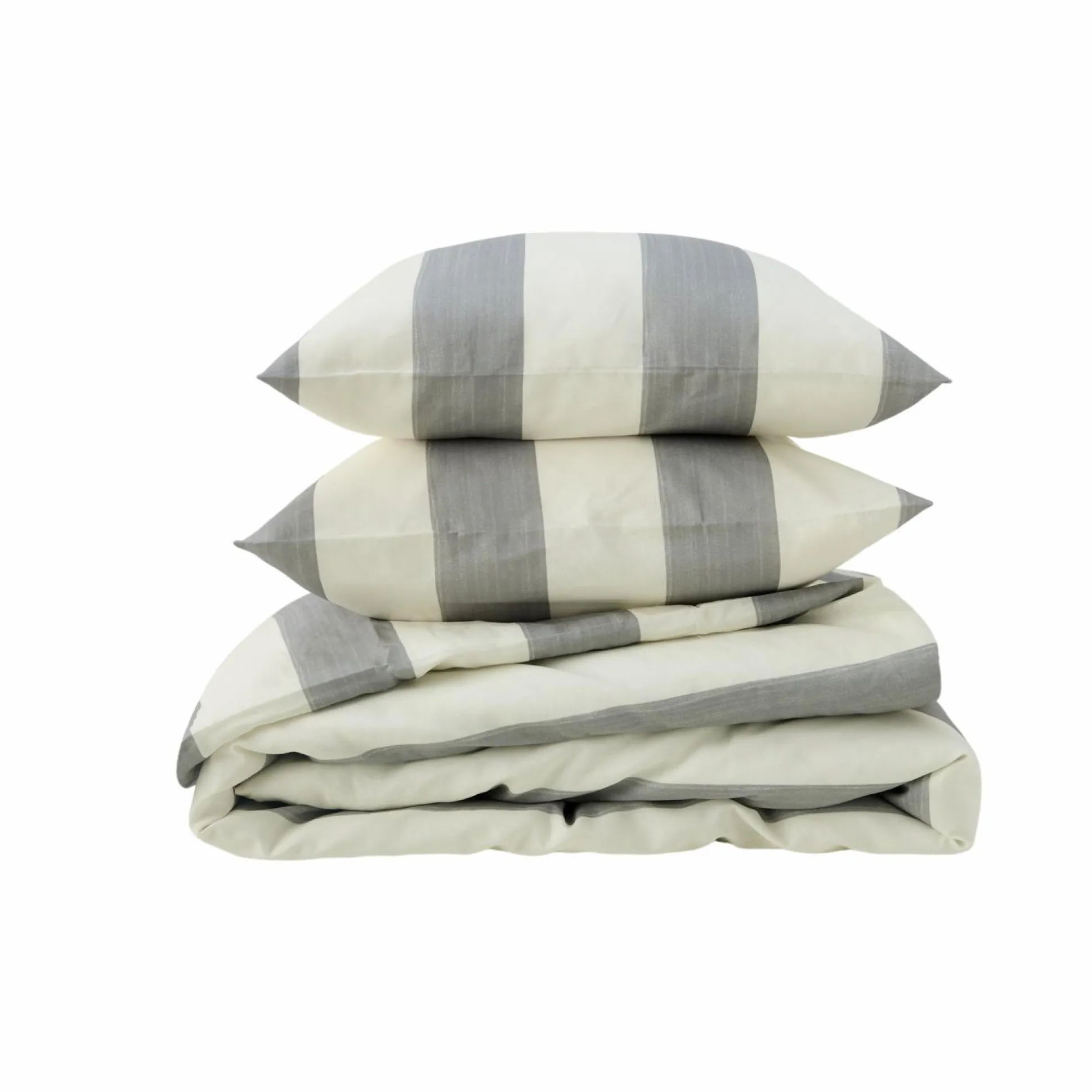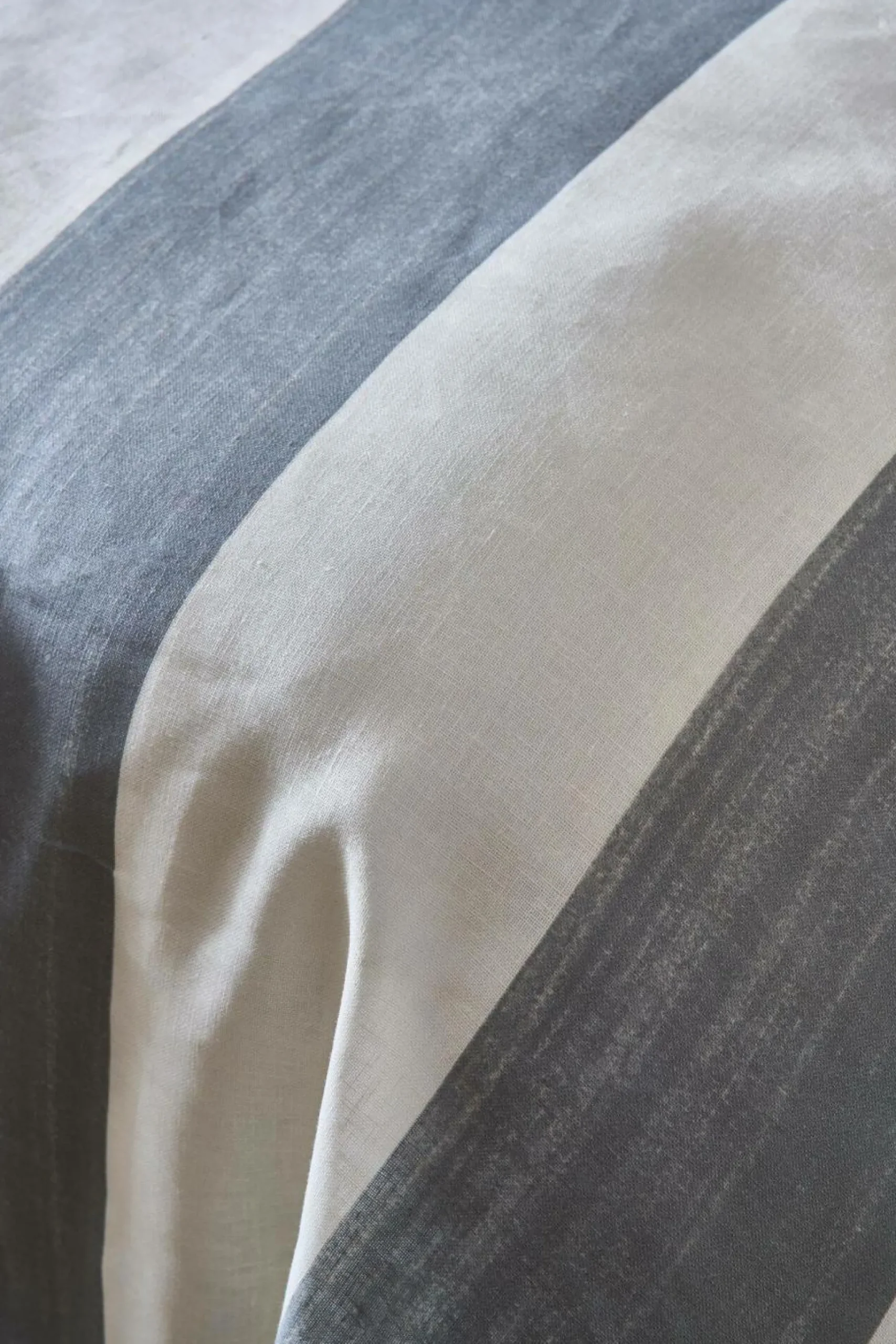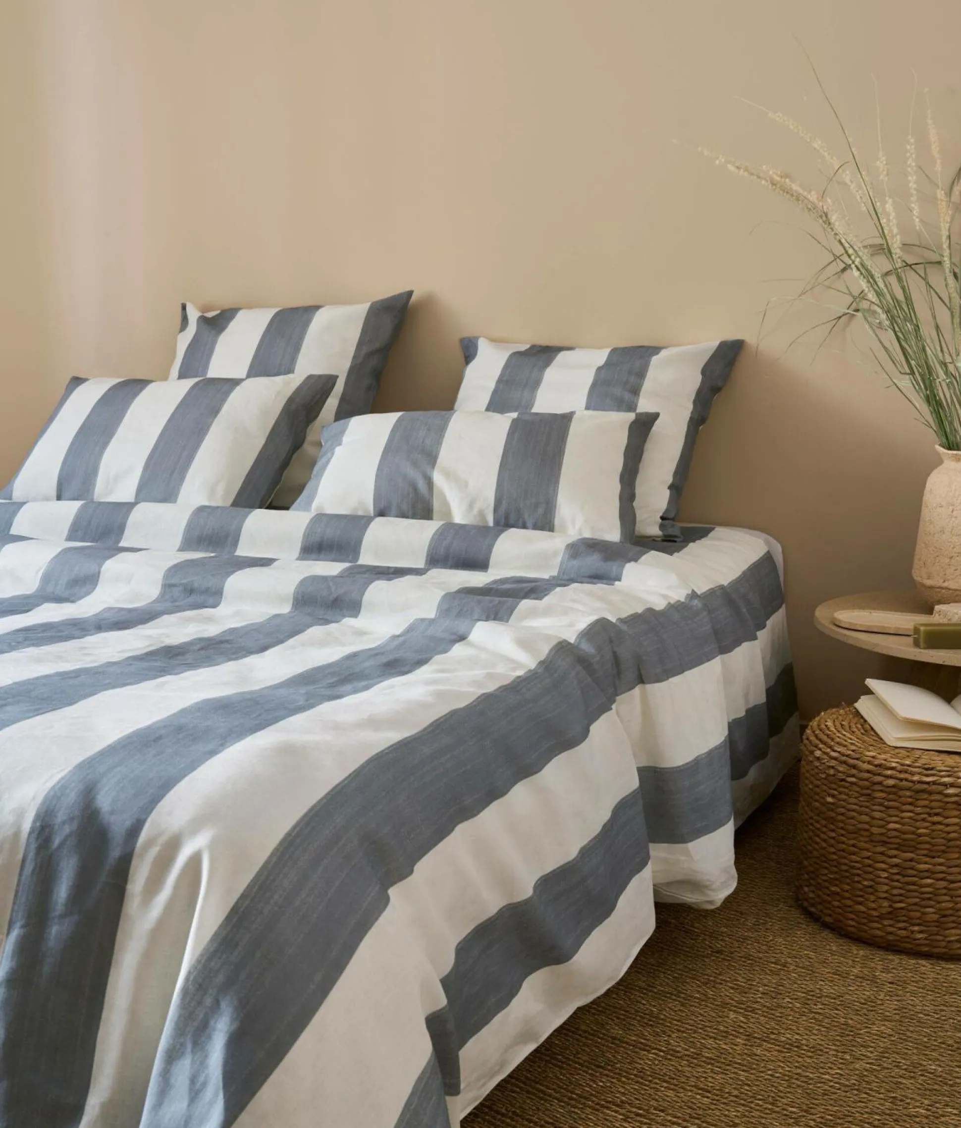 La parure de lit Oyat présente ses rayures de caractère, généreuses et larges, comme tracées d’un coup de pinceau. Elle évoque une balade sur le littoral, les embruns salés qui viennent caresser les volets patinés des maisons.