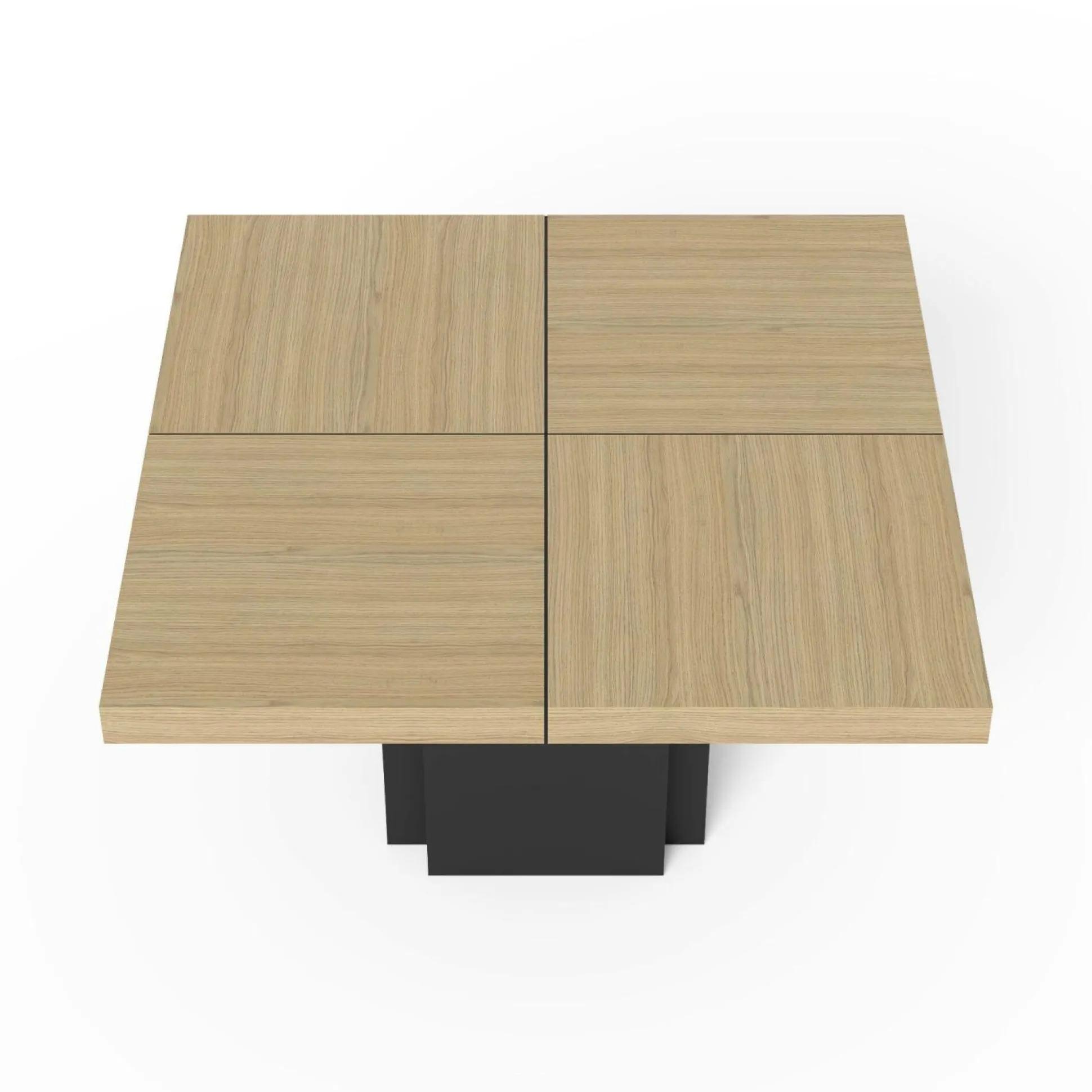 Son plateau est composé de 4 panneaux carrés à assembler et repose sur un pied centralégalement carré. Cela offre solidité etstabilité à la table et permet plus facilement l’installation desinvités autour sans avoir de pieds qui gêne.