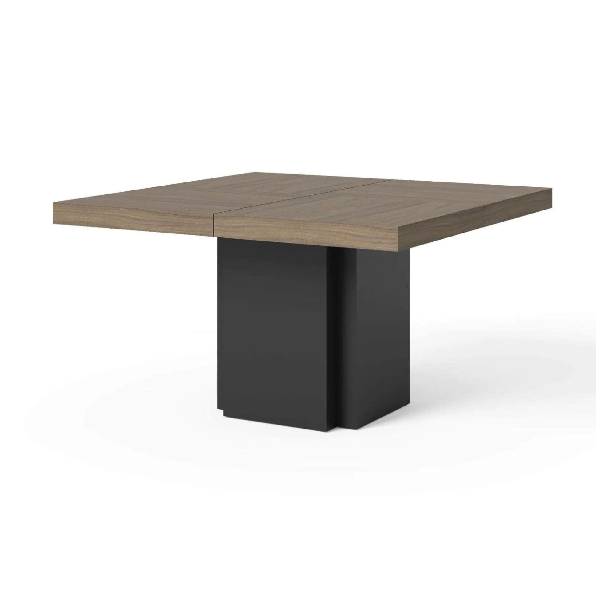 Son plateau est composé de 4 panneaux carrés à assembler et repose sur un pied centralégalement carré. Cela offre solidité etstabilité à la table et permet plus facilement l’installation desinvités autour sans avoir de pieds qui gêne.